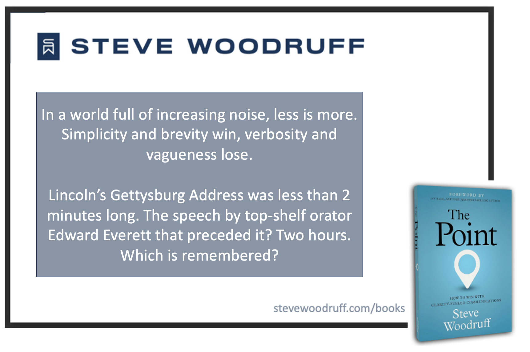 My first book, Clarity Wins, emphasized the role of clarity in brand identity and messaging, but my second book, The Point, contains a universal and timeless formula for ALL forms of communication (including branding, of course).